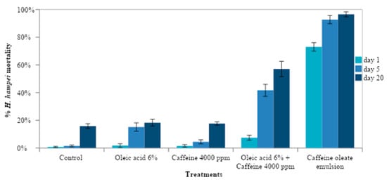 Therefore, the effect of caffeine emulsions at a concentration of 0.4% w/w caffeine and 6% w/w oleic acid was evaluated, and this caffeine concentration was 10 times higher than that reported by Araque et al. (2007) []. Preliminary data indicated that for CBB, high survival was observed at doses below 0.1% caffeine; in D. melanogaster, the response depended on the delivered dose of the alkaloid [].