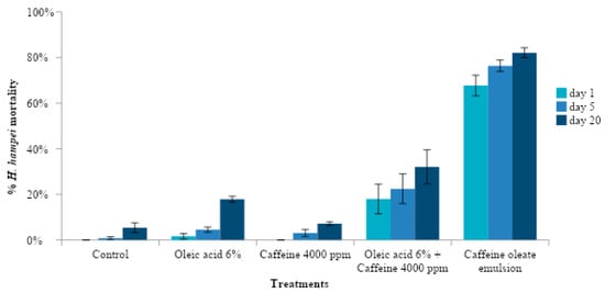 To understand the mode of action of the caffeine oleate emulsion and to know the effect of each one of the components, the pre-infestation and post-infestation effect of each emulsion component was evaluated (Table 2). In T5, the mixture of oleic acid 6% and caffeine 4000 μg mL−1 was heated at a temperature of 80 °C for 10 min, in order to obtain the caffeine oleate emulsion. In T4 the mixture was not heated.