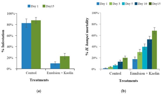 For the branches sprayed with water, a large percentage of fruits were attacked by the coffee borer (Figure 7a). For the branches where the most concentrated kaolin emulsion was applied, the insects did not penetrate the fruits and avoided them in such a way that infestation did not exceed 23% after 15 days, reducing the number of fruits attacked by CBB on the trees by up to 60% compared to that in the control with water (p < 0.0001), (t test). The toxicity of the emulsion plus kaolin to H. hampei was confirmed in the field, as high mortality was found (Figure 7b) that was higher than that in the control with water.