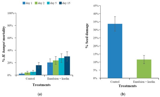 Regarding the percentage of healthy seeds (Table 3), there were also differences between the control and the emulsions (ANOVA, F = 76.28, DF = 2.24, p < 0.0001) and according to Dunnett’s test at 5% (p < 0.001). In the control, 37% of the seeds were not infested, while with the application of the emulsions, protection of the seeds was observed, with 94% of the seeds remaining healthy with the emulsion containing kaolin and 89% with the emulsion alone.