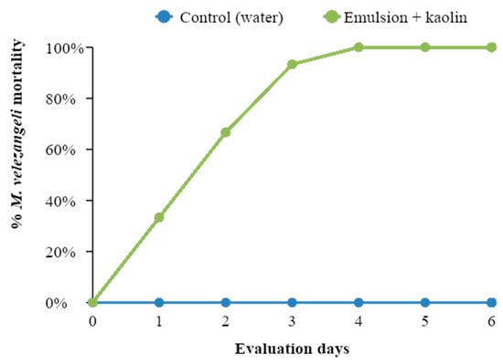 The increased activity of the emulsion with the addition of kaolin could be due to the abrasive and adsorptive properties of kaolin against epicuticular lipids []. Some studies have reported on the insecticidal properties and mechanisms of action of mineral particles such as kaolin []. It has been established that this type of material causes structural alteration or partial elimination of the epicuticle, which leads to rapid losses of water from the insect’s body and mortality by desiccation []. The presence of kaolin in the emulsion, in addition to causing desiccation, could also allow greater penetration of the insect by the emulsion, increasing its effectiveness.