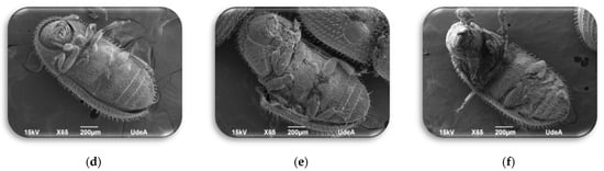 The anatomical changes induced on CBB by their contact with caffeine oleate were analyzed by scanning electron microscopy (Figure 11). A right dorso-lateral view of non-treated CBB is presented on Figure 11a showing its head, thorax, and abdomen. Figure 11d presents the ventral view of non-treated CBB, where it is possible to observe elements such as mouthparts, antenna, legs, abdominal sternites, and wings. Images of CBB sprayed with COEK are shown in Figure 11b (dorsal view) and Figure 11e (ventral view). The direct contact of CBB dorsum with COEK spray droplets induced a significant separation of CBB pronotum from the CBB elytra, increasing the distance between these two body sections up to 270 μm (Figure 11b). On the other hand, the insect ventral view shows a partial destruction of mouthparts and a significant displacement of wings moving away from the thorax (Figure 11e).