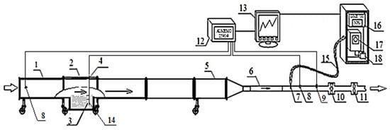 Scheme of ammonia emission from manure in a wind tunnel: 1—wind tunnel; 2—cover; 3—manure storage chamber; 4—section for storing manure; 5—transition cone; 6—duct (100 mm diameter); 7—air sampling probe; 8—temperature and humidity sensors; 9—thermoanemometer sensor; 10—the valve; 11—fan with frequency converter; 12—meter-accumulator “Almemo 2590-9”; 13—computer (AMR program); 14—thermopores; 15—heated air supply hose; 16—laser gas analyzer “GME700”; 17—electrically heated three-channel valves; 18—diaphragm air pump.