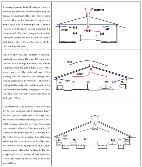 Ammonia is the main gas that acidifies precipitation, damaging the ecosystem. These two gases pollute the atmosphere and harm livestock kept in stables. Even low concentrations of NH3 (10 mg m−3) in the barn air worsen the health of the animals, damage the upper respiratory tract and the mucous membranes of the eyes, increase blood pressure, damage the heart, and reduce productivity and the animals’ resistance to diseases. If the ammonia concentration is above 20 mg m−3, immediate measures must be taken to reduce the concentration [1]. The permissible concentration of ammonia gas in stable air is regulated by individual states. In Lithuania, the ammonia concentration is limited to 15 ppm 11 mg m−3 in the rooms where calves are raised and to 25 ppm 18 mg m−3 in the stalls for young and adult cattle [1]. Ammonia consists more than 90% of total NH3 in livestock and evaporates at all stages of manure formation, storage and spreading on the soil [2]. Ammonia emission processes in animal husbandry receive more attention than other gases [3]. Numerous studies have been performed analyzing microclimatic factors, as well as their importance and influence in cowsheds: air velocity [4,5], air temperature [6,7,8,9], relative humidity [10] and manure-contaminated surface areas [11]. Cattle are an important source of emissions and have the highest emission factors compared to other animals [12]. In the German livestock industry, most ammonia is emitted in naturally ventilated barns [13]. This view is shared by researchers in other countries [14]: naturally ventilated dairy barns are one of the main sources of ammonia and greenhouse gas emissions to the atmosphere. It is difficult to clean the air in these barns. To reduce emissions, the use of a hybrid ventilation system is recommended, in which the barns are naturally ventilated, and the air is exhausted from the slurry ducts with a mechanical ventilation system [15].