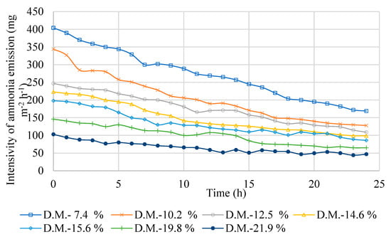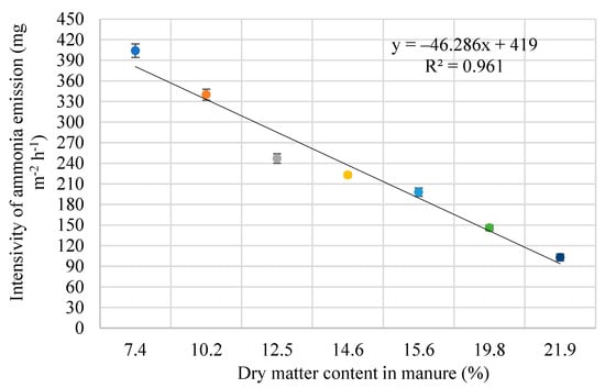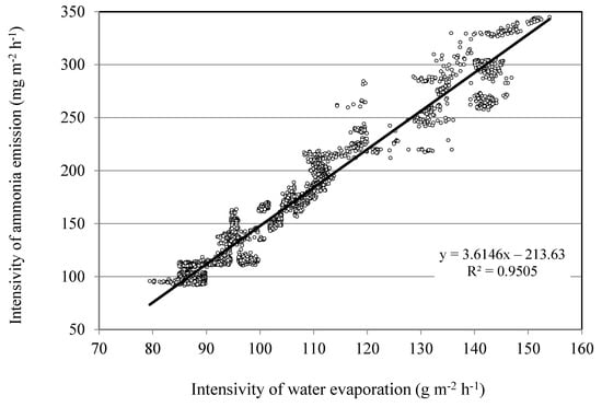 Although the evaporation intensity of ammonia and water from manure varies, a strong correlation was found between these values (Figure 6), according to which the intensity of ammonia emission can be predicted by the evaporation intensity of water from manure. A strong correlation between ammonia emissions and water evaporation from manure was also found in studies with manure with different moisture contents: D.M.-7.1 ± 0.29%; D.M.-10.9 ± 0.38%; D.M.-13.2 ± 0.36%; D.M.-22.7 ± 0.51%.