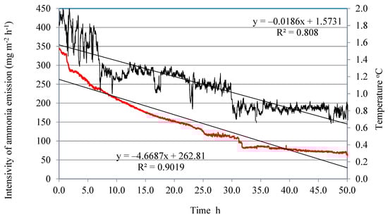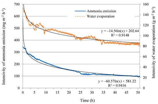 The evaporation of ammonia from manure is related to the intensity of moisture evaporation. When the manure is stored, water evaporates intensively (Figure 5), the moisture of the manure surface decreases and a crust is formed, which reduces ammonia emissions. In 50 h, the evaporation rate of water from fresh liquid manure is reduced by about two-fold (from 150 g m−2 h−1 to 80 g m−2 h−1) and ammonia emissions are reduced by more than three-fold (from 340 mg m −2 h−1 to 100 mg m−2 h−1). During the tests, the temperature of the clean air supplied to the chamber was constant at 20.3 ± 0.8 °C, the relative air humidity was equal to 49.4 ± 3.7%, and the chamber was ventilated at a constant intensity. During the research, the average manure temperature was 20.7 ± 0.29 °C. The manure used for the research contained 0.34% of total nitrogen (N) and 0.05% of ammonia nitrogen (N-NH4), and the average pH of the manure during the research was 7.03 ± 0.21.