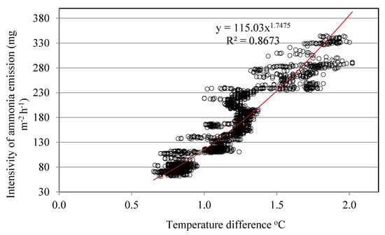 Dependence of ammonia emission intensity on the difference between manure layer and surface temperatures (manure D.M.-10.9 ± 0.38%).