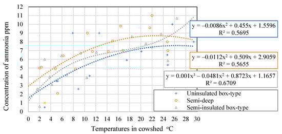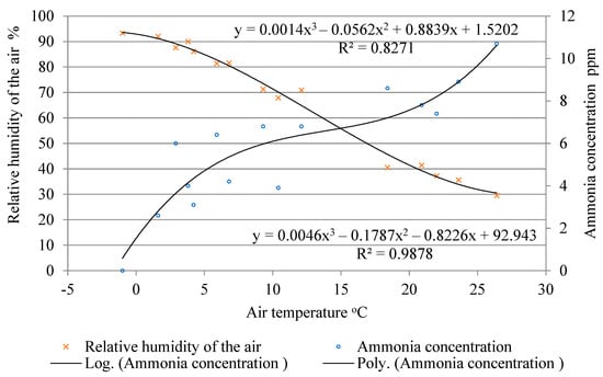 At low temperatures and high humidity in the barn, ammonia concentration is not always low (Figure 10). At that time the ventilation channels are very closed and the intensity of ventilation is greatly reduced, which affects the increase in ammonia concentration. When the temperature increases and the air humidity decreases in the barn, the concentration of ammonia does not always increase proportionally, because when it is warm outside, the ventilation ducts are opened and the barns are ventilated very intensively. For example, in a semi-warm cow house at a temperature of 2.5–5.9 °C, air speed varied from 0.31 to 0.45 m s−1, the ammonia concentration varied within the following limits: 3.1 ± 0.06–6.4 ± 0.09 ppm; with an increasing temperature above 20.0–26.4 °C, air speed increased to 0.97–1.32 m s−1, and the range of ammonia concentration change remained similar: 7.8 ± 0.08–10.6 ± 0.11 ppm. Even in the event of a drop in temperature, a decrease in ventilation intensity can lead to a poor microclimate.