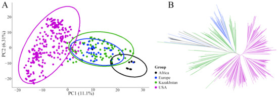 Population structure in studied barley collection. (A) Principal component analysis (PCA) plot and (B) unrooted neighbor-joining (NJ) tree of the studied barley collection including accessions from the USA, Kazakhstan, Europe, and Africa.