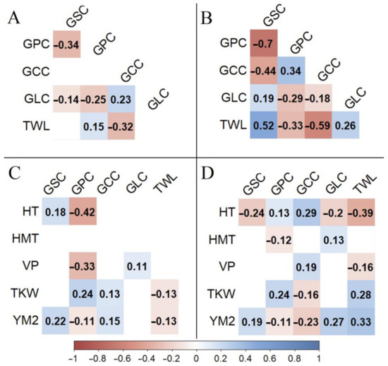 Matrices of Pearson correlation coefficients (r). The data among grain quality traits in (A) 2020 and (B) 2021 and between grain quality traits and adaptability- and yield-related traits in (C) 2020 and (D) 2021. Cells with significance p < 0.05 are highlighted in color. The red color denotes a negative correlation and the blue color denotes a positive correlation. Color intensity increases with the decrease in p.