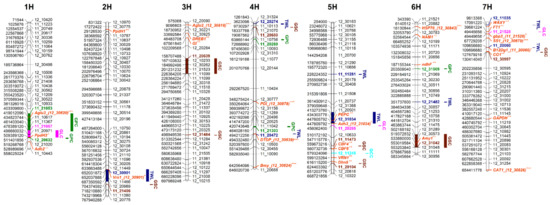 Genetic map of QTLs for barley grain quality traits identified in the study. Positions are indicated in base pairs (bps) to the left of the chromosome, with SNP and QTL names indicated on the right. Genes and SNPs associated with traits are highlighted in color. Due to the unknown position of SNP 12_30678, only 25 out of 26 QTLs are shown. *—positions obtained from the Triticeae Toolbox [57]. **—positions obtained from Barley 50k iSelect SNP Array [66]. ***—positions obtained from Szűcs et al. [67].