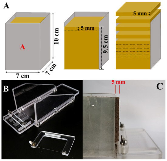 The soil incubation experiments were conducted using a specially designed cuboid container (Figure 1A) made of polyurethane with dimensions of 7 cm length, 10 cm height, and 7 cm width and a movable baffle called “Side A” for easy soil sampling. Seven treatments, including CP, HAP0.1, HAP0.5, HAP1, HAP5, HAP10, and a no-fertilizer control treatment (NCT), were applied, with three replicates for each treatment. Except for NCT, the P application rate was 3 g P2O5 kg−1 of soil dry weight [19]. The soil moisture content was adjusted to 50% of the field capacity and precultured in a climate chamber in the dark at 25 °C for 10 days. The soil moisture content was then adjusted to 60% of field capacity, and each incubation container, containing 688 g of soil with a soil bulk density of 1.23 g cm−3, was subpackaged. During the addition process, the soil was compacted in layers, and the final height was 9.5 cm. The phosphate fertilizers were accurately weighed and evenly spread on the soil surface, and the container was covered with pierced plastic wrap to prevent excess water evaporation and ensure ventilation. The containers were then moved into a climate chamber and incubated under dark conditions at 25 °C. Distilled water was added using a weighing method to maintain the soil moisture level at around 60% of field capacity.