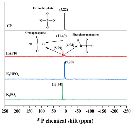 The presence of phosphate esters in HAPs was confirmed by generating solid-state 31P NMR spectra for CP and HAP10 (Figure 3). The spectra of reference phosphates indicated that the signal peaks of K2HPO4 and K3PO4 were at 5.20 and 12.34 ppm, respectively. In the spectrum of CP, we observed a shift in the peak at 5.22 ppm, indicating the formation of K2HPO4, the reaction product of phosphoric acid and potassium hydroxide. However, the spectrum of HAP10 showed three single peaks at 11.40, 5.99, and 4.04 ppm. This result confirmed that in addition to the orthophosphates of K2HPO4 (5.99 ppm) and K3PO4 (11.40 ppm), other forms of P existed in HAP10. Combined with the FTIR second derivative spectra (Figure 2B), this suggests that phosphate esters (4.04 ppm) were present in HAP10.