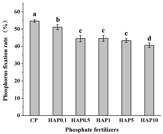 We compared the water-soluble P fixation rate of various HAPs with that of CP alone (Figure 4), and found that the addition of HA to phosphate fertilizer at any tested proportion (HAP0.1–HAP10) resulted in a 6.3–25.6% lower water-soluble P fixation rate relative to CP alone (p < 0.05). In addition, the water-soluble fixation rate decreased with the amount of HA added. These findings demonstrate that HA in HAP can effectively prevent fertilizer-derived P from being immobilized (Figure 4).