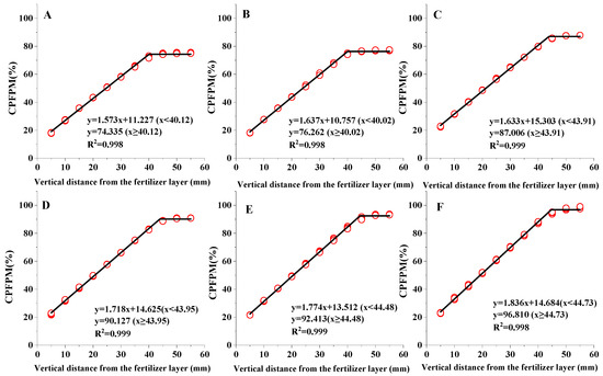 Variation in the cumulative percentage of fertilizer P migration (CPFPM) with increasing vertical distance from fertilization layer within 0–55 mm. (A–F) were the variation curves of CP, HAP0.1, HAP0.5, HAP1, HAP5, and HAP10 fertilizers, respectively.