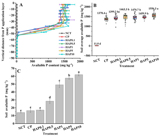 Distribution of soil total P content in the soil layer 0–90 mm from the P application layer (A), and comparison of soil total P content in the soil layers 45–50 mm (B), and 50–55 mm (C) from the P application layer. Treatments with no letter in common were significantly different at p < 0.05, as indicated by the LSD test.