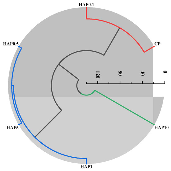 To determine the ideal proportion of HA in HAPs for promoting fertilizer-derived P migration and transformation in soil, hierarchical cluster analysis was conducted. The results showed that HAP0.1 was clustered with CP, indicating that 0.1% HA was insufficient to promote fertilizer-derived P migration in soil, which was consistent with the weaker effects of HAP0.1 in improving P migration and availability (Figure 5A and Figure 7B). Conversely, HAP10 showed the highest CPFPM peak (Figure 6F) and soil average available P content (Figure 7B) within the 0–40 mm soil layer, indicating its superiority in terms of promoting P migration and enhancing P availability. Therefore, HAP10 was separated into a distinct class after cluster analysis (Figure 9). The remaining HAPs were clustered together, indicating that differences in the effects of HAs at 0.5%, 1%, and 5% on fertilizer P migration and transformation were limited. Based on the cost and production process of HAPs, 0.5% HA might be the optimal amount for incorporation into P fertilizer.