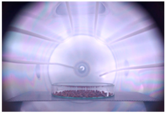 The inside of a vacuum vessel with a volume of 20 L, as shown in Figure 1, was filled with oxygen gas with a pressure of 20 to 80 Pa, and a high-frequency power with a frequency of 13.56 MHz and a power of 20 to 60 W was installed along the inner wall of the vacuum vessel. It was charged into a linear discharge electrode to generate a capacitance-coupled oxygen plasma [5,6,11,12,13,14,15,16]. At this time, an electric discharge occurred in a space of 1 to 2 cm between the electrode and the inner wall of the vacuum vessel, and the generated oxygen ions became neutral active species by charge exchange while diffusing toward the center of the vacuum vessel. Figure 2 shows a picture of seed treatment in oxygen plasma. In the afterglow region, seeds were placed 150 mm away from the linear discharge electrode fixed on the inner surface of the vacuum vessel. The electron density at the seed position was 106 cm−3 or less. Neutral reactive oxygen species (excited oxygen atoms O (1D), O (5P), singlet oxygen molecules 1∑g+, etc.) in oxygen plasma were measured by UV-Vis light emission spectroscopic analysis. A neutral active oxygen species (oxygen atom O (5P), singlet oxygen molecule 1∑g+, etc.) in oxygen plasma was allowed to act on seeds. Seeds were bound in a non-woven bag so that high-energy ions in oxygen plasma were blocked.