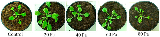 Figure 3 shows the effect of oxygen plasma on the growth of the Arabidopsis plant at different pressures. It was clearly identified from this figure that oxygen pressure of 20 Pa gave maximum plant growth. The leaf area of Arabidopsis in control with changing the cultivation period is shown in Figure 4.