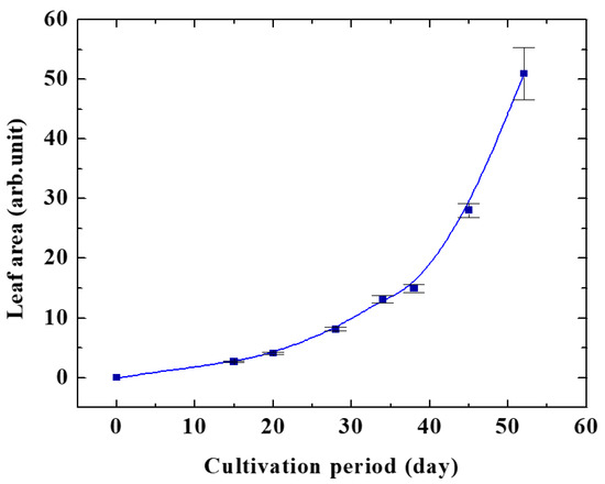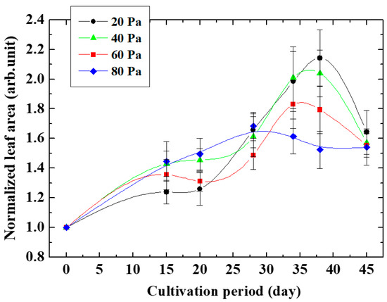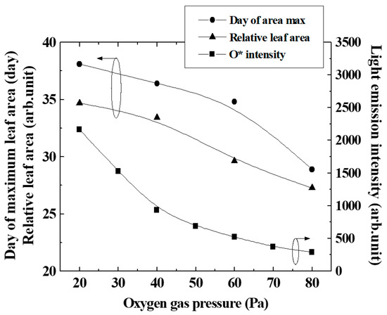 As shown in Figure 6, the relative leaf area decreased slightly with the oxygen gas pressure, even though the O* intensity varied significantly. From our experiments so far, the maximum growth promotion effect was about 1.5–2 times. In this experiment, the growth enhancement effect probably would reach the maximum at pressures of 20 and 40 Pa, and it was inferred that the leaf size did not change even with excessive irradiation of active oxygen. The oxygen gas pressure dependence of the maximum leaf area showed the same trend as the number of cultivation days when the leaf area ratio was maximized. As a result, the area of the leaves was considered to increase.