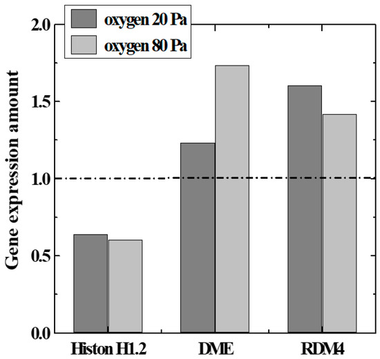 To confirm the above hypothesis, we focused on genes related to modification and chromatin structure (histone H1.2 [12]) among genes with remarkable expression fluctuations. Expression levels of epigenetics-related genes (DME, RDM4, etc. [13]) were measured by the microarray method and the real-time PCR method. The genes encode enzyme production that catalyzes the demethylation reaction in DNA, and histones which regulate the structure of the chromosomal region surrounding the genes. A quantitative comparison of Histone 1.2, DME, and RDM4 expression levels with various parameters of plasma irradiation is shown in Figure 7. The data in the figure satisfied a T-test by a p-value of 0.05 or less. DME and RDM4 expression was upwardly regulated by irradiation with oxygen plasma, whereas histone H1.2 expression was downwardly regulated. This result suggests that histone methylation was suppressed by irradiation with oxygen plasma. It is possible to obtain gene expression profiles of seeds obtained by cultivating plasma-irradiated seeds (second-generation seeds). Unlike the first-generation seeds directly irradiated with plasma, DME and RDM4 expression levels were about the same as those without irradiation, and the histone H1.2 expression levels were considered to be increased [5].