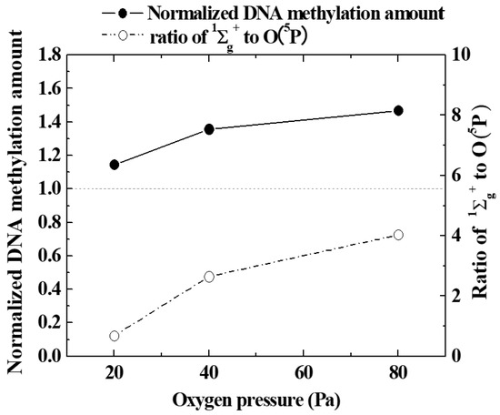 In order to quantitatively evaluate the promotion of epigenetic gene expression by oxygen plasma irradiation, the amount of DNA methylation (methylation of cytosine 5-position) was measured with a quantitative reagent. A black circle (●) in Figure 8 shows how the amount of methylated DNA in seeds irradiated with oxygen plasma generated by changing oxygen pressure was influenced by oxygen gas pressure. It can be seen that the higher the oxygen pressure, in the range of 20 to 80 Pa, the greater the methylation of seed nuclear DNA by irradiation with oxygen plasma. Therefore, it was confirmed that epigenetic gene expression was promoted at lower oxygen pressures. This was consistent with the tendency of DNA demethylation predicted in Figure 6 and Figure 7. At the same time, the emission intensity ratio of 1∑g+ and O (5P) obtained from the emission spectroscopic spectrum is indicated by a white circle (○). This can be roughly considered as the abundance ratio of 1∑g+ and O (5P). The amount of methylated DNA increases with the pressure of oxygen gas. As this tendency was similar to the pressure change of the ratio of 1∑g+ to O (5P), it is possible that 1∑g+ was a major factor controlling DNA methylation as well as the excited oxygen atom.