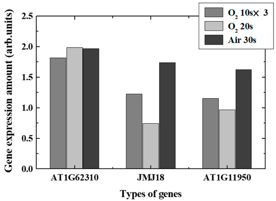 The change in the expression level of each gene was different from the changes in gas type and plasma conditions. When comparing Air and O2 plasmas, the total amount of change in the expression level of DME and RDM4 was larger in the O2 plasma. Even if the oxygen pressure was increased, the expression level of linker histone gene methylation was common in both cases, and the total amount of changes in gene expression related to DNA demethylation increased. This confirmed that the epigenetic gene modification was regulated by irradiation of seeds with the oxygen plasma and that gene expression related to growth could be improved.
