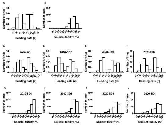 Figure 1. Distribution of heading date and spikelet fertility of the RILs in 2019 and 2020. (A,B) Heading date and spikelet fertility in 2019. (CF) Heading date at four sowing dates in 2020. (GJ) Spikelet fertility on four sowing dates in 2020. SD1, SD2, SD3, and SD4 indicated the first, second, third, and fourth sowing dates, respectively.