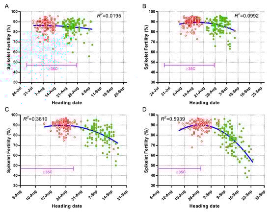 Figure 2. Correlation between heading date and spikelet fertility in 2020. (A), The first sowing. (B) The second sowing. (C). The third sowing. (D). The fourth sowing. The pink line indicates the period when the daily maximum temperature exceeded 35 °C. The green dots indicate subpopulation 1, which carried the Dan71 functional allele at the DTH8 locus. The red dots indicate subpopulation 2, which carried the ZH161 nonfunctional allele at the DTH8 locus.