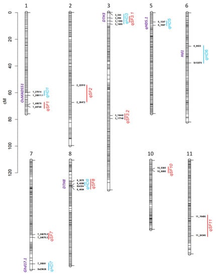 Figure 3. Chromosomal (numbered on the top) locations of QTL for heading date and spikelet fertility detected in the D71/ZH161 RIL population. HD, heading date (d); SF, spikelet fertility (%).