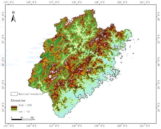 The geographical location and administrative division of Fujian Province are shown in Figure 2. Fujian Province is located on the southeast coast of China, between 23°33′ N~28°20′ N and 115°50′ E~120°44′ E. It is 480 kilometres wide from east to west, and 530 kilometres long from north to south, with a land area of 124,000 square kilometres. Fujian has a subtropical maritime monsoon climate. The topography of Fujian Province is complex and diverse, and the influence of nonzonal factors, such as topography and geomorphology, regional differences in water and heat conditions, and vertical divergence, is more obvious therein, resulting in a variety of local microclimates. These conditions provide superior natural conditions of water and heat for the development of farmland and its development and utilization.