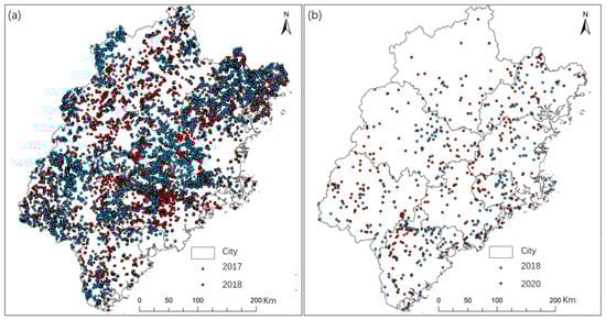 Validation sample point distribution map, (a): validation point of the farmland in 2017 and 2018; (b) validation point of the abandoned farmland in 2018 and 2020.