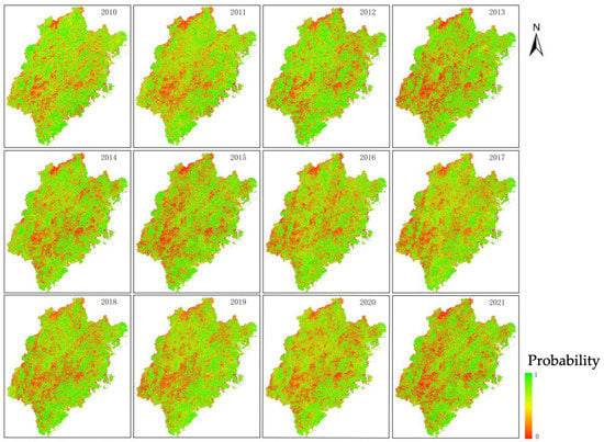 Figure 4 shows the results of the time series farmland probability classification from 2010 to 2021.
