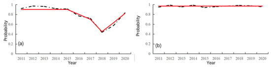 LandTrendr fitting results. (a) Typical abandoned farmland; (b) Non-abandoned farmland. The black dotted line represents the probability of farmland, and the red line represents the fitted lines found using LandTrendr.