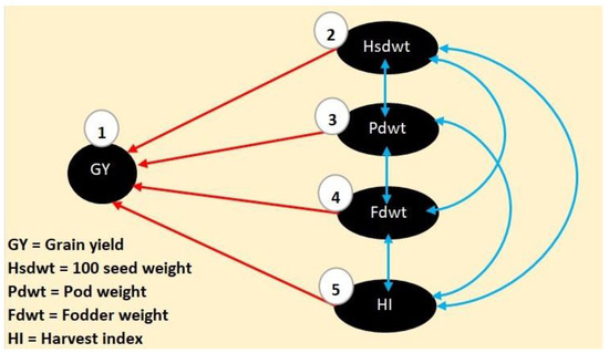 where is the observed phenotypic correlation coefficient between traits and and is the path coefficient between traits and . The subscripts 1, 2, 3, 4, and 5 refer to grain yield, 100 seed weight, pod weight, fodder weight, and harvest index, respectively. The direct effect that each trait has on grain yield is measured by , while the indirect effect of a trait on grain yield, which occurs through that trait with another trait, is measured by the product .