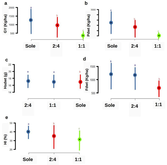 Mean comparisons among the three cropping patterns for five cowpea traits: (a) grain yield (GY), (b) pod weight (Pdwt), (c) 100 seed weight (Hsdwt), (d) fodder weight (Fdwt), and (e) harvest index (HI). On the x-axes, “Sole” refers to sole cropping; “1:1” refers to 1 row of millet to 1 row of cowpea; “2:4” refers to 2 rows of millet to 4 rows of cowpea. In each plot, lines with the same color or the same letter are not significantly different from each other. The circles on the lines indicate the mean of each cropping pattern. The alignments of cropping patterns on the graph are in descending order, starting with the cropping patterns that have the highest mean.