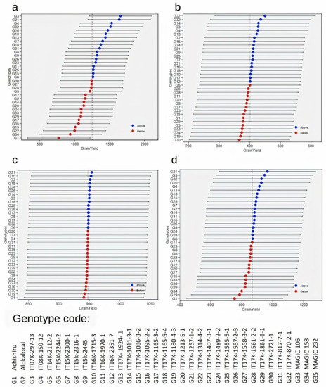 Yield performance of genotypes under specific cropping patterns based on the BLUPs model: (a) sole cropping, (b) 1:1 cropping pattern, (c) 2:4 cropping pattern, and (d) overall performance across patterns and years. Vertical dashed lines indicate the mean values; the red and blue dots represent genotype performance above and below the means, respectively.