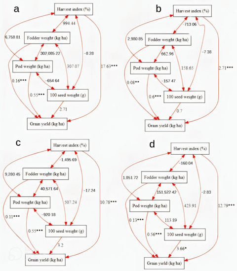Path analysis was conducted using lavaan R package [37] for four traits related to yield; namely, 100 seed weight, pod weight, fodder weight, and harvest index (Figure 2). Grain yield was considered as the response variable in the path model. Phenotypic linear correlation coefficients were partitioned into components of direct and indirect effects, as follows [38,39]: