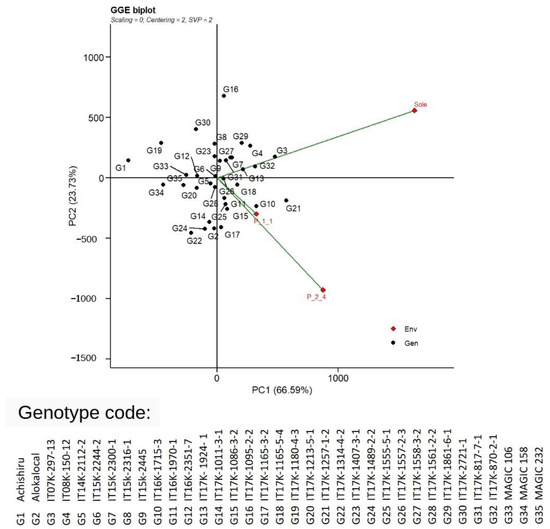Further analyses dissected the stability of genotypes across and within each cropping pattern (Figure 7). Stability analysis based on grain yield alone revealed that genotype IT17K-1257-1-2 (G21) was the highest-yielding on average and quite stable across the three cropping patterns given that it was projected the furthest on the average environment axis (AEA) with a short perpendicular mark on this axis (Figure 7). Generally, in order of productivity, IT17K-1257-1-2 (G21) was the most productive, followed by IT07K-297-13 (G3), IT16K-1715-3 (G10), and IT17K-870-2-1 (G32), yet IT16K-1715-3 (G10) was the most stable genotype given that it had the shortest perpendicular mark to the AEA. On the other hand, Achishiru (G1), IT17K-1180-4-3 (G19), and MAGIC 158 (G34) were the least productive genotypes in terms of grain yield performance across the three intercropping patterns.