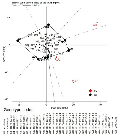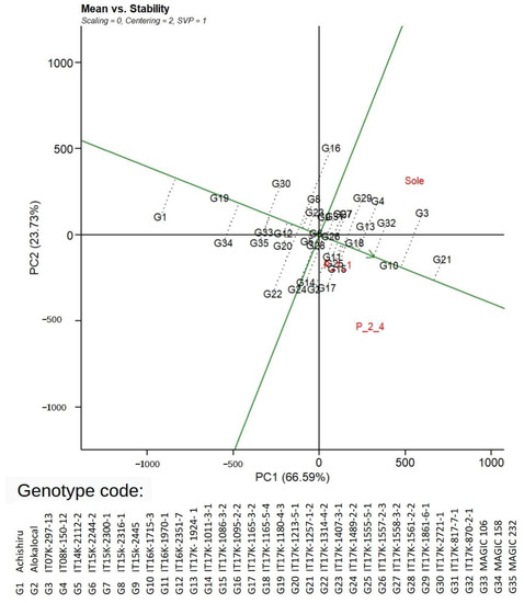- Yan, W.; Kang, M.S. GGE Biplot Analysis: A Graphical Tool for Breeders, Geneticists, and Agronomists, 1st ed.; CRC Press: Boca Raton, FL, USA, 2002; ISBN 9780429122729. [Google Scholar]