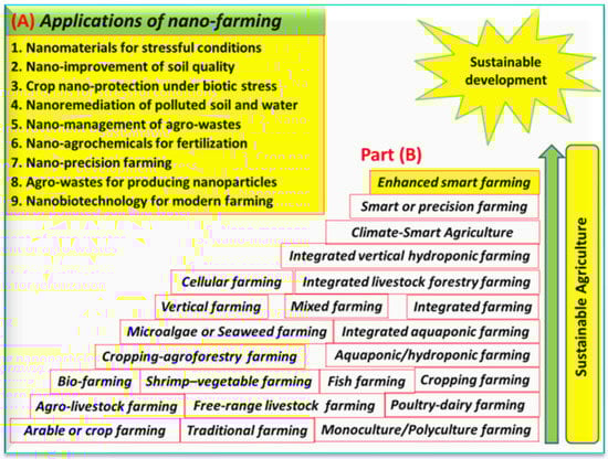 The suggested applications of nanotechnology for different types of farming with the goal of achieving sustainable agricultural development (Part (A)). Part (B) presents different types of farming in a pyramid form, where common 20th-century large-scale practices form the base (e.g., monoculture farming) and sustainable practices are at the top (e.g., enhanced smart farming).