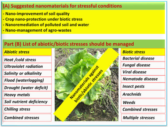 Nanomaterials (NMs) provide a promising approach to support cultivated plants under stressful conditions through many activities, including improving soil quality, protecting plants against stress, removing pollutants from soil, and managing agro-wastes through the application of NMs (Part (A)). Some examples of different biotic/abiotic stresses that cultivated plants face are given in Part (B).