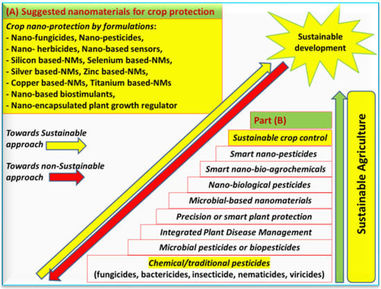 Different approaches for crop protection using nanomaterials with a focus on different formulations of nanopesticides (Part (A)). Part (B) presents a list of selected words related to crop protection, starting with (from the base) traditional pesticides, then moving towards the smart nanopesticides and sustainable crop control to achieve sustainable agricultural development.