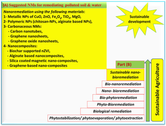 Nanoremediation of soil and water using selected nanomaterials (NMs) are presented in Part (A). Part (B) includes some common terms in the remediation field, starting with the common mechanisms of phytoremediation, such as phytoextraction, then moving to bioremediation, and finally, sustainable nano-bioremediation as a promising technique for achieving sustainable agricultural development.
