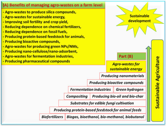 Agriculture includes several activities that prepare the soil to support seeds or seedlings until harvest. Some of these farming activities are major sources of pollution in the agriculture sector. Thus, the accumulation of mismanaged agro-wastes has created environmental issues, especially in developing countries [99]. Agro-waste should be addressed to safeguard the environment and preserve renewable resources (Figure 7). The benefits of doing so may include: (1) improving soil fertility and crop productivity; (2) reducing dependence on mineral fertilizers; (3) reducing dependence on fossil fuels; (4) producing protein-based feedstock for animal feeding; (5) producing bioactive compounds; (6) producing both nanomaterials and nanoparticles; (7) producing pharmaceutical compounds; (8) use as feedstock in fermentation industries; (9) producing asphalt binder or as natural aggregate in concrete; and (10) producing nano-adsorbents [99]. On the other hand, many environmental problems can happen when these agro-wastes are mismanaged, causing pollution of soil, water, and air. This pollution may cause hypoxia, harmful algal blooms, and eutrophication in water bodies, which may pose health risks and economic costs [100,101].