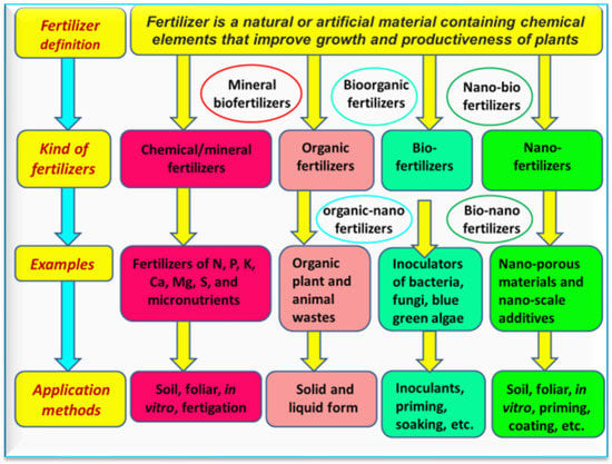 Important information about fertilizers, including the definition, different kinds, examples of each, and the expected methods of application for cultivated crops (adapted from El-Ramady et al. [121]).