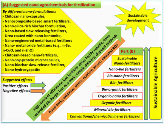 Fertilization is an important farming activity that exerts important controls on crop production, especially under intensive agriculture. There are several kinds of fertilizers, which include traditional (chemical/mineral and some forms of organic), bio-, and nanofertilizers (Figure 8). These fertilizers have different roles in achieving sustainable agricultural development. It could be noticed that bio- or nano-fertilizers (mainly biological synthesized nanofertilizers) are more sustainable than organic fertilizers and preferable due to their benefits on the economic and environmental level. Engineered nanomaterials (ENMs) have been applied in many fields in recent years, including medicine and human health [115], water desalination [116], renewable energy [117], cosmetics [118], textile fabrication [73], environmental cleanup [119], and electronics [120]. Due to intensive application, there is an urgent need to consider the environmental implications of using NMs, appropriate regulation of engineered NMs [69], and environmental remediation issues [74]. Furthermore, the commercial production of several nanomaterials has generated toxic wastes, which may create health and safety risks [19].