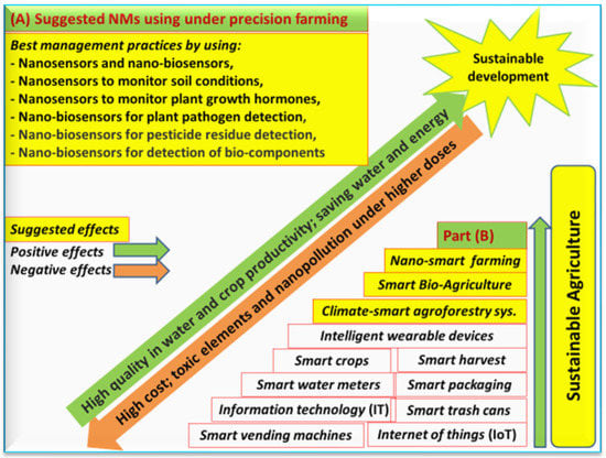 Different ways to apply nanomaterials (NMs) for smart and/or precision farming are listed in Part (A). These NMs may include nanosensors and others as promising approaches for the development of sustainable agricultural practices. Part (B) shows terms related to smart fertilizers, starting with Global Positing System (GPS), smart vending machines, and nano-smart farming as high-level approaches towards sustainability. Some positive and negative effects of nanofarming are also shown.