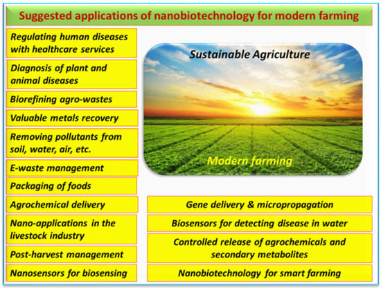 The combination of interdisciplinary fields that address different applications of biotechnology to nanotechnology is called nanobiotechnology (NBT). Applications of NBT can be found in the fields of agriculture, health, medicine, imaging, drug delivery, immune-proteomics, tissue engineering, cosmetics, pharmacy, and more [159]. Nanobiotechnology has great potential for the development of new nano-biosensors, drug delivery and gene therapy tools, nano diagnostics, nano crop protection and management, nano postharvest processing, and bio-compatible nanodevices (Figure 11). Nanomaterials and nanoparticles can be biosynthesized using biological methods, which have several applications during farming practices, such as: