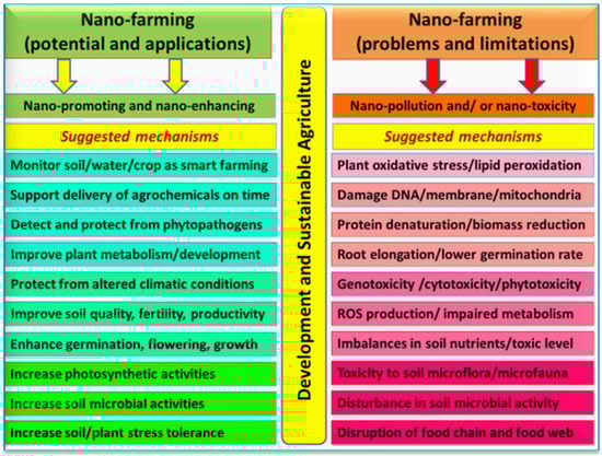 There are many potential sources of nanopollution under nanofarming management. This may result from activities before, during, and/or after cultivation due to the excessive application of nanomaterials. Nanopollutants may include nano-glass, fibers, plastics, biologics, metals or metal oxides, etc. Nanoparticles of glass can result from waste windshield glass, and nano-plastics are a major threat to environmental and human health. Nanoparticles of glass have been shown to inhibit the germination of wheat seeds and the length of roots and shoots and reduce chlorophyll content [184]. The impacts of nano-plastics on terrestrial plants are negative, particularly during early development stages (i.e., germination and root growth). These negative effects have been documented in many plant species (e.g., lettuce, maize, rice, and wheat), irrespective of the size and polymer type of the nano-plastic. This has been attributed to the negative influence of these nano-plastics on chlorophyll content, and the formation of free radicals or ROS [185]. Due to the wide range of applications of nanomaterials, there are also abundant possibilities for environmental nano-pollution, and this increases as the use of NMs increases. Nanoparticles can end up in water, air, and soil and may pose a major threat due to their small size. Therefore, this threat should be controlled and managed [22,26,177]. Nanopollution is called “invisible pollution” because NPs can easily penetrate the cells of plants, animals, and through human skin, leading to serious consequences. They can also accumulate in plants, entering humans via the food chain and causing health problems [22].